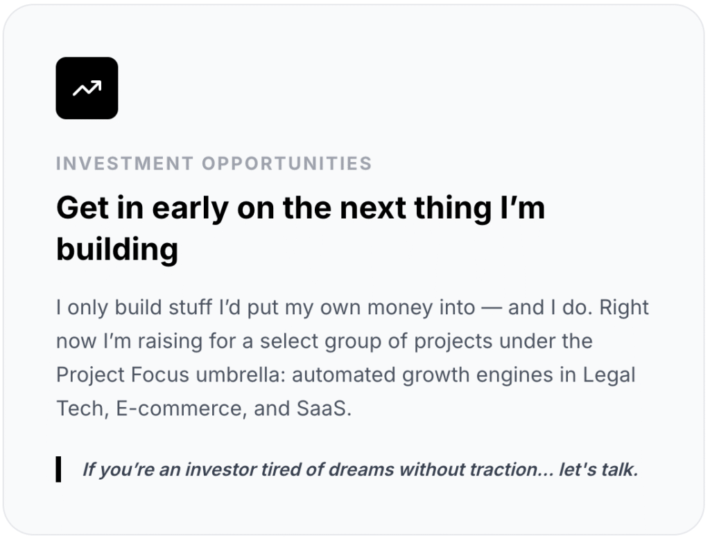 Whether you want to fix what you have or jump into something new I’m building… let’s talk for 15 minutes. I’ll tell you straight what’s holding your growth back right now (for free), or I’ll show you the investment opportunities currently open.